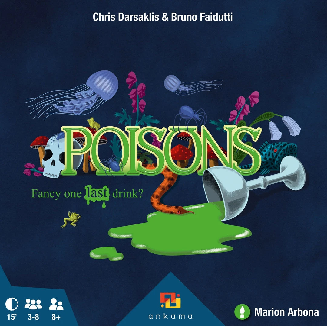 Poisons is a bluff-based card game where players will have to carefully weight their risks to earn points. Each turn, players will secretly put a card from their hand in each opponent’s drink: an innocuous liquid or a deadly poison. When everyone got their cup filled, each player decides whether they will drink the content of their cup.