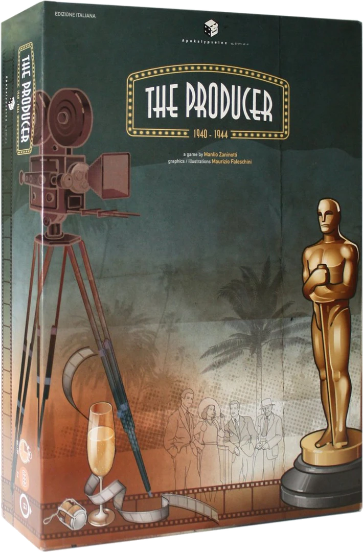 The Producer: 1940-1944 is a board game inspired by the great Hollywood movies. The aim of the game is to score more points by winning awards for actors and film directing, building the structures of their studio, or producing more films of different genres. The player must decide which strategy to follow early in the game based on the script and cast with which depart.