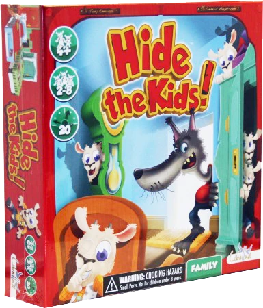 Hide the Kids! is based on the Grimm Brothers tale of The Wolf and the Seven Young Kids. The game has been adapted for young children and is an on-table version of the all time children’s favorite game “Hide & Seek”. Within the game one of the players is chosen to take on the role of the wolf (finger-puppet) and the others players take on the role of the kids. The wolf will turn around and slowly count to ten, during which time the “kids” quickly hide under or behind the furniture. At each turn, the wolf is permitted to uncover two pieces of furniture, if a Kid is discovered, the wolf wins a Kid token. The kids win Pebble tokens if they are not found and will win more tokens if there are hidden and remain undiscovered while in the clock or in the tub. The first player, wolf or kid, to collect 7 tokens wins.Â