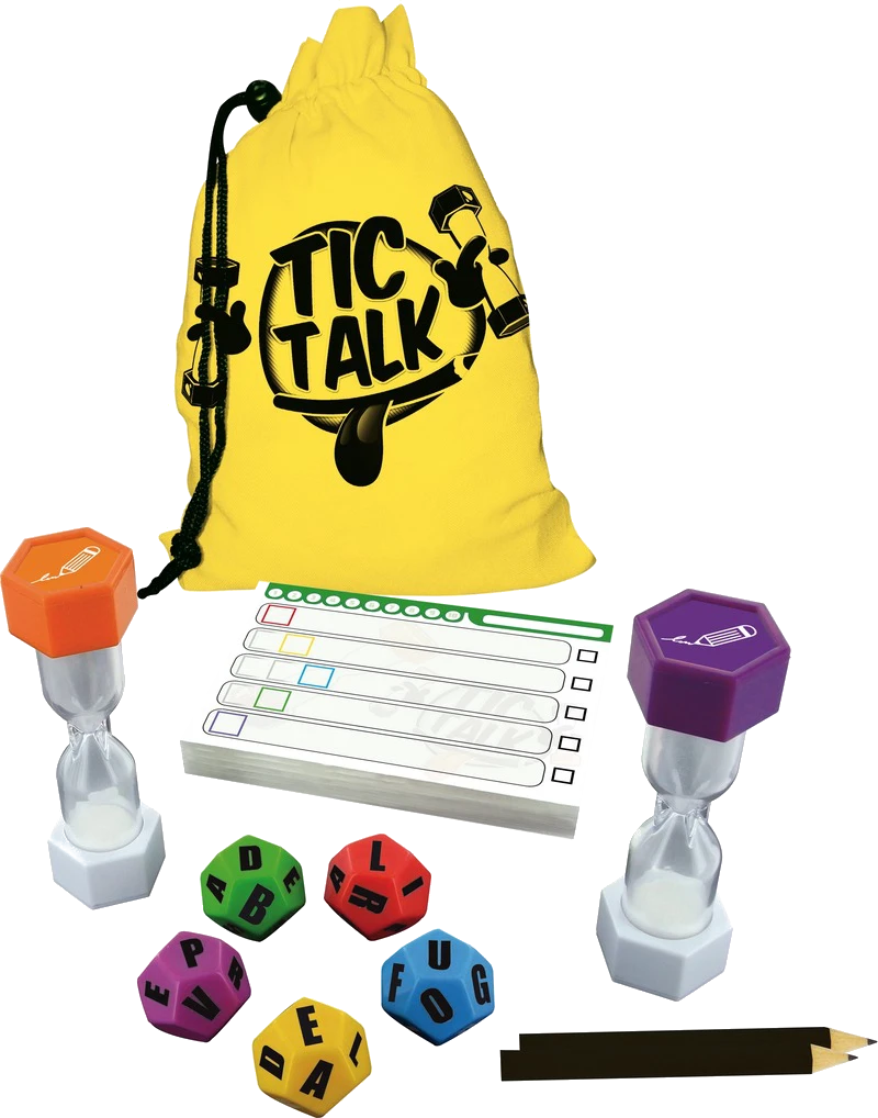 Tic Talk pits two teams against one another each round, with one team creating words and the other trying to figure out what was created. At the start of a round, one team flips its sand timer, then rolls five colored, twelve-sided letter dice; each color corresponds to a row on a paper tablet, with the red die indicating what the first letter in a word must be, the yellow die indicating the second letter in a separate word must be, and so on. The team members think up words that fit these constraints as quickly as possible, stopping the sand timer once they’ve finished.