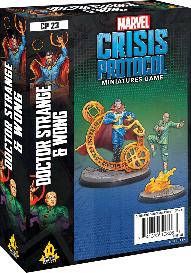 Marvel: Crisis Protocol – Doctor Strange & Wong contains a miniature of each character, two character stat cards, three team tactic cards, one affiliation card, one Infinity Gem card, and twelve tokens.
