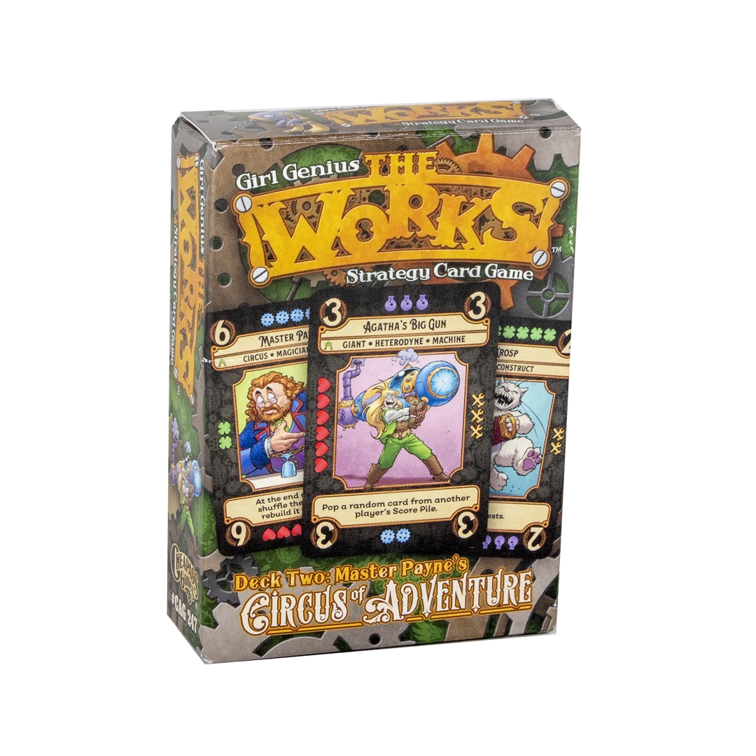 Girl Genius: The Works is a non-collectible card game that consists of several standalone decks of cards. You can play the game with any one of those decks, while also being able to combine some or all of those decks into a single deck for a longer game or a game with more players. Each deck contains many unique cards, but the gameplay is the same in all cases.