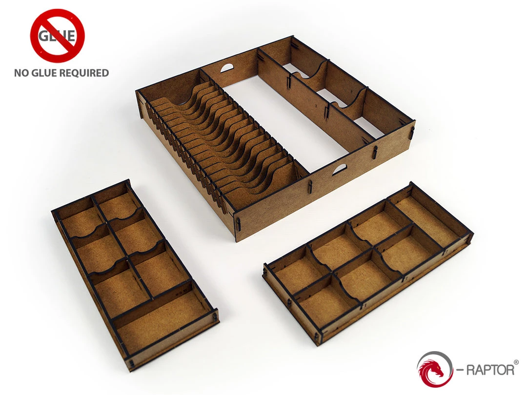 The insert is durable and made of high quality HDF. To assemble it, there is no glue required. It allows to hold all components inside the box, including board and manual.
