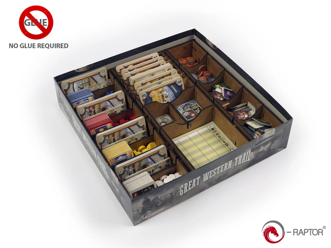 e-Raptor Insert compatible with Great Western Trail is a perfect accessory designed to organize and improve gameplay of the board game.