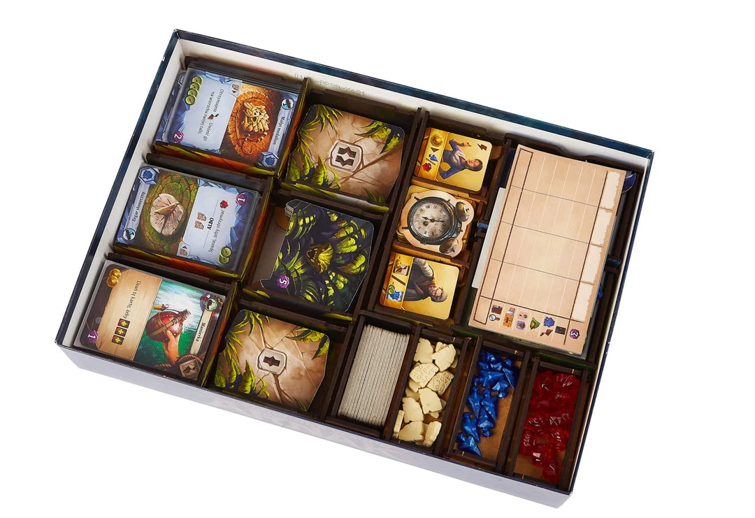e-Raptor UV Print Insert compatible with Lost Ruins of Arnak is your must-have accessory designed to organize and improve the experience of the gameplay. Thanks to our insert you can arrange all game components and sleeved cards to keep them in order – no more mess on the table while playing. No more looking for necessary elements during the game.