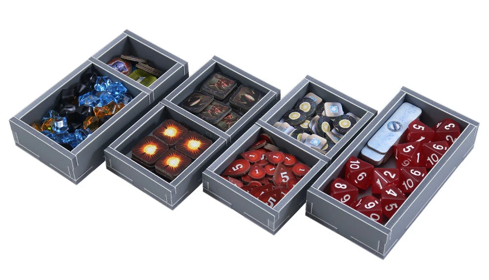 There are four token trays that come with the insert. These can be used in different ways, depending upon your collection. The taller open tray is best suited to the red dice and larger tokens. The other taller tray on the end with the divider is best for the plastic gems.Â