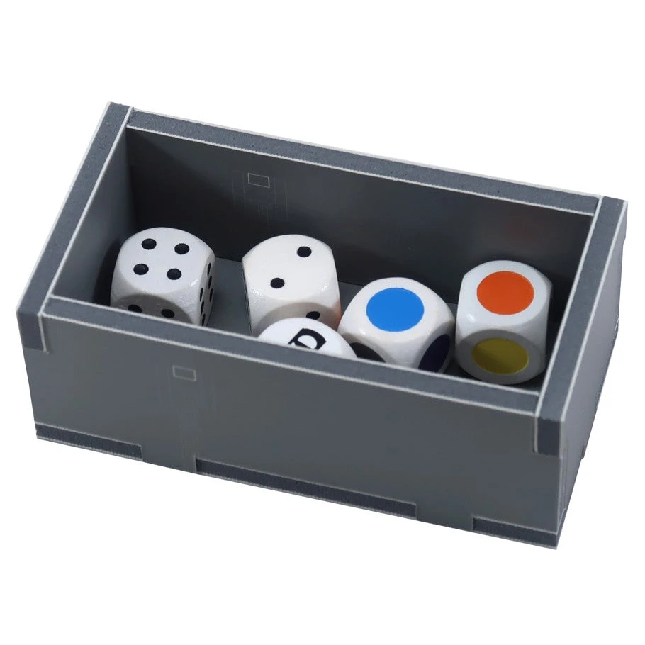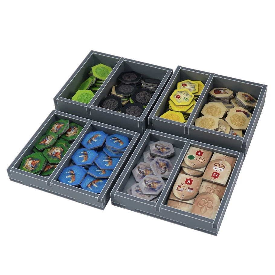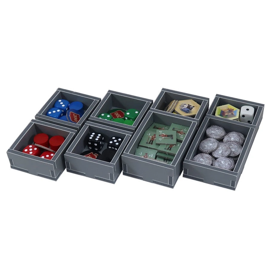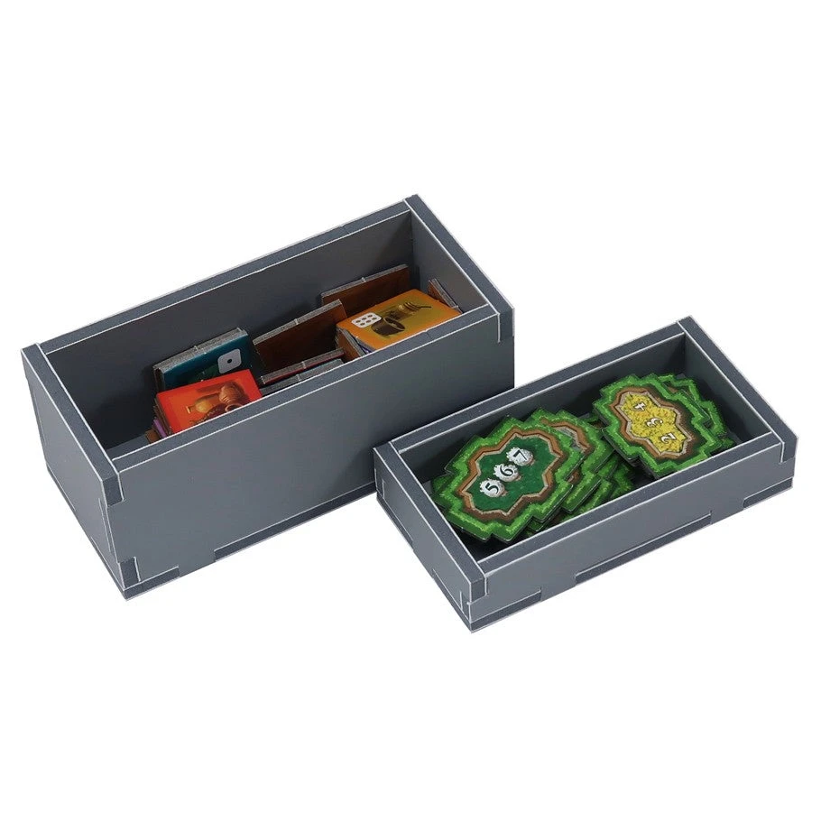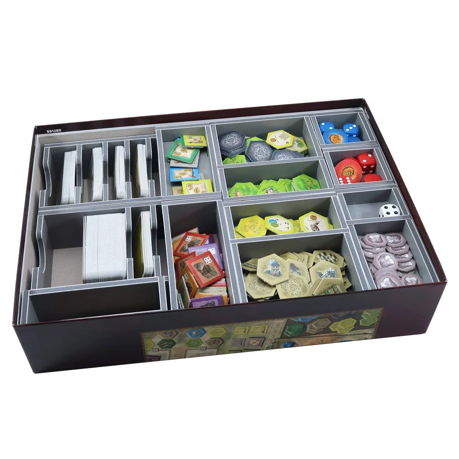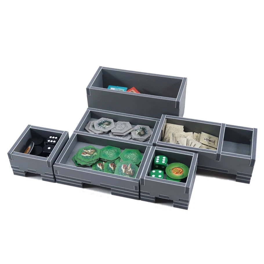Insert compatible with Castles of Burgundy: Anniversary Edition®, and also has trays for The Card Game® version. The design provides both efficient storage and improved game play. The trays can be utilized during the game, and they greatly aid set-up and clear-away times. The rules and boards act as a lid on top of the trays.