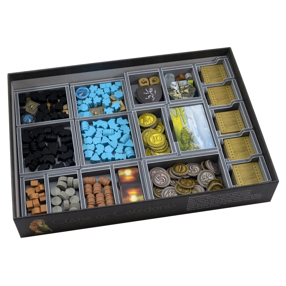 Note: Insert designed for game with external box dimensions of 22.4 x 31.1 x 5.0 cm. This is an updated version of the original Clans of Caledonia® insert FS-CLAN.