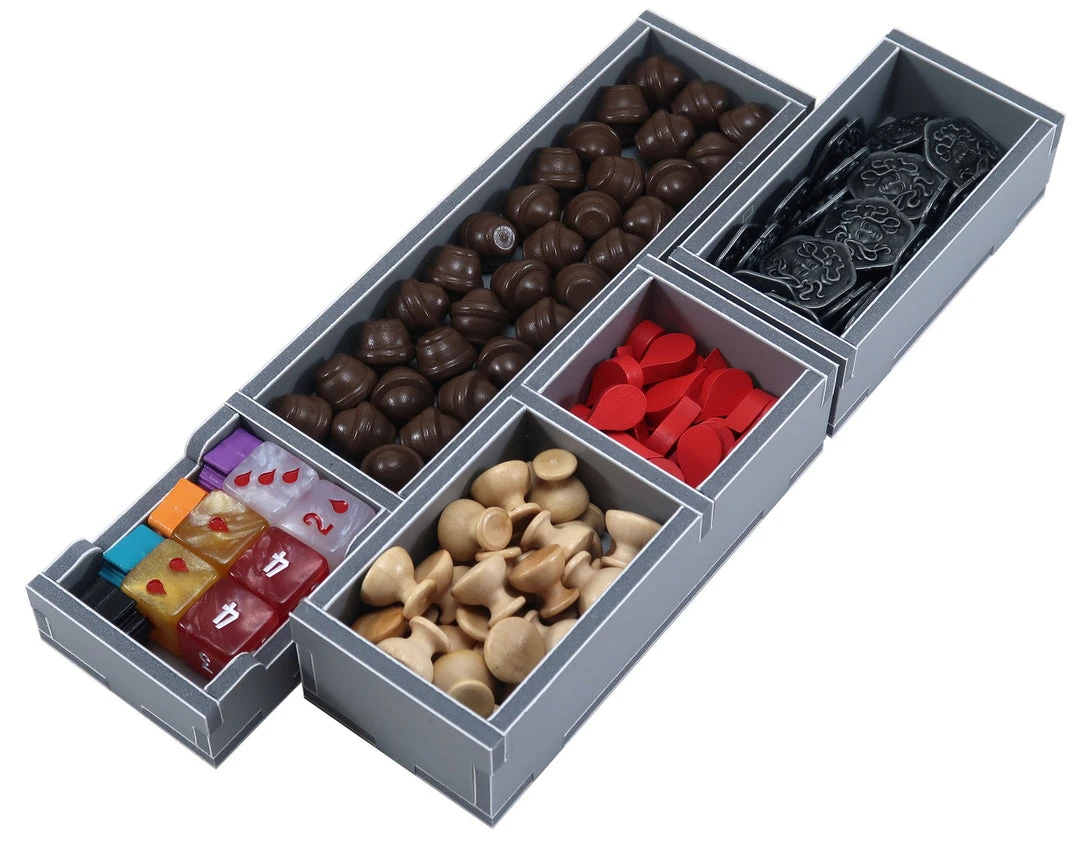 Insert compatible with Raiders of Scythia®. The design provides both efficient storage and improved game play. Many of the trays can be utilized during the game, and they greatly aid set-up and clear-away times.
