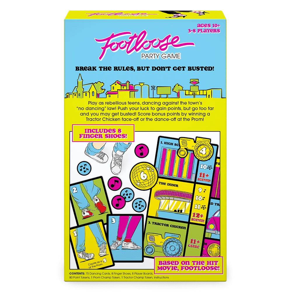 Play as rebellious teens dancing against the small town’s “no dancing” law! Cut loose around Bomont, from the drive-in diner and the old mill to the honky tonk, pushing your luck to gain points. Score bonuses by winning a tractor-chicken face-off or the dance-off at the Prom. To win, break the rules, but don’t get busted! With its colorful retro look and fun and flexible “finger shoes,” this family-friendly party game celebrates the 1980s hit movie in style!