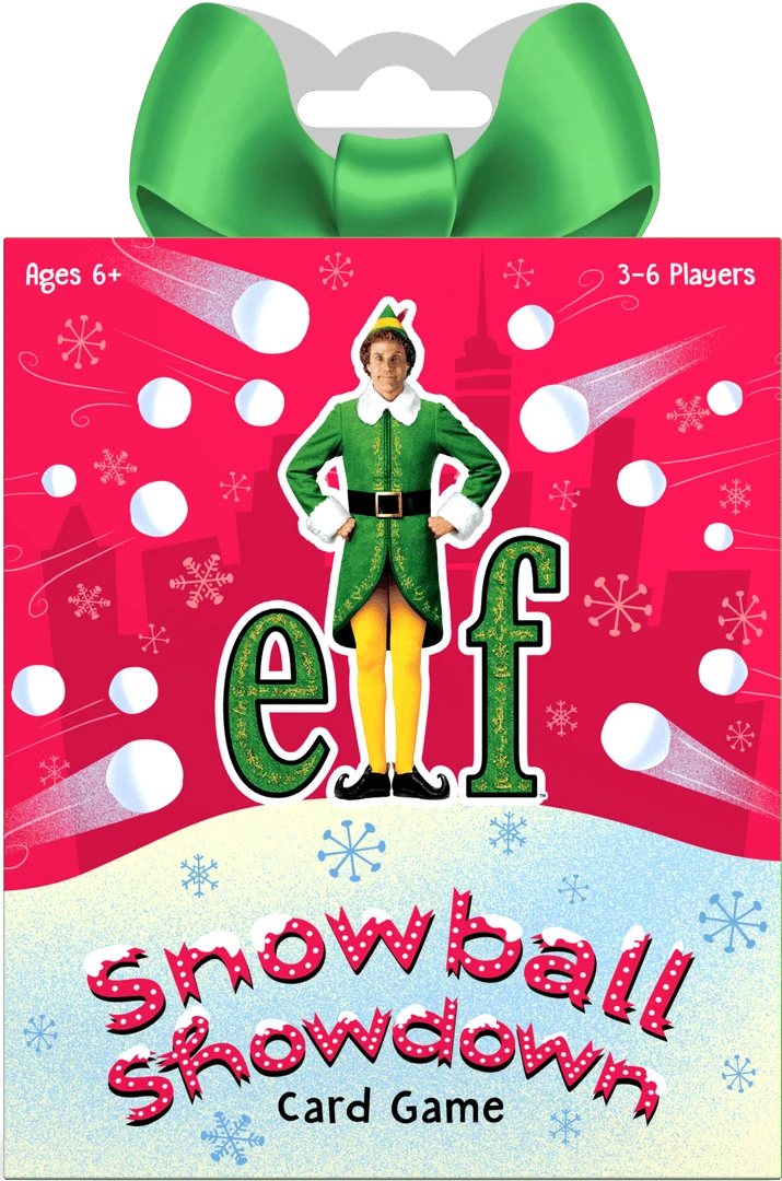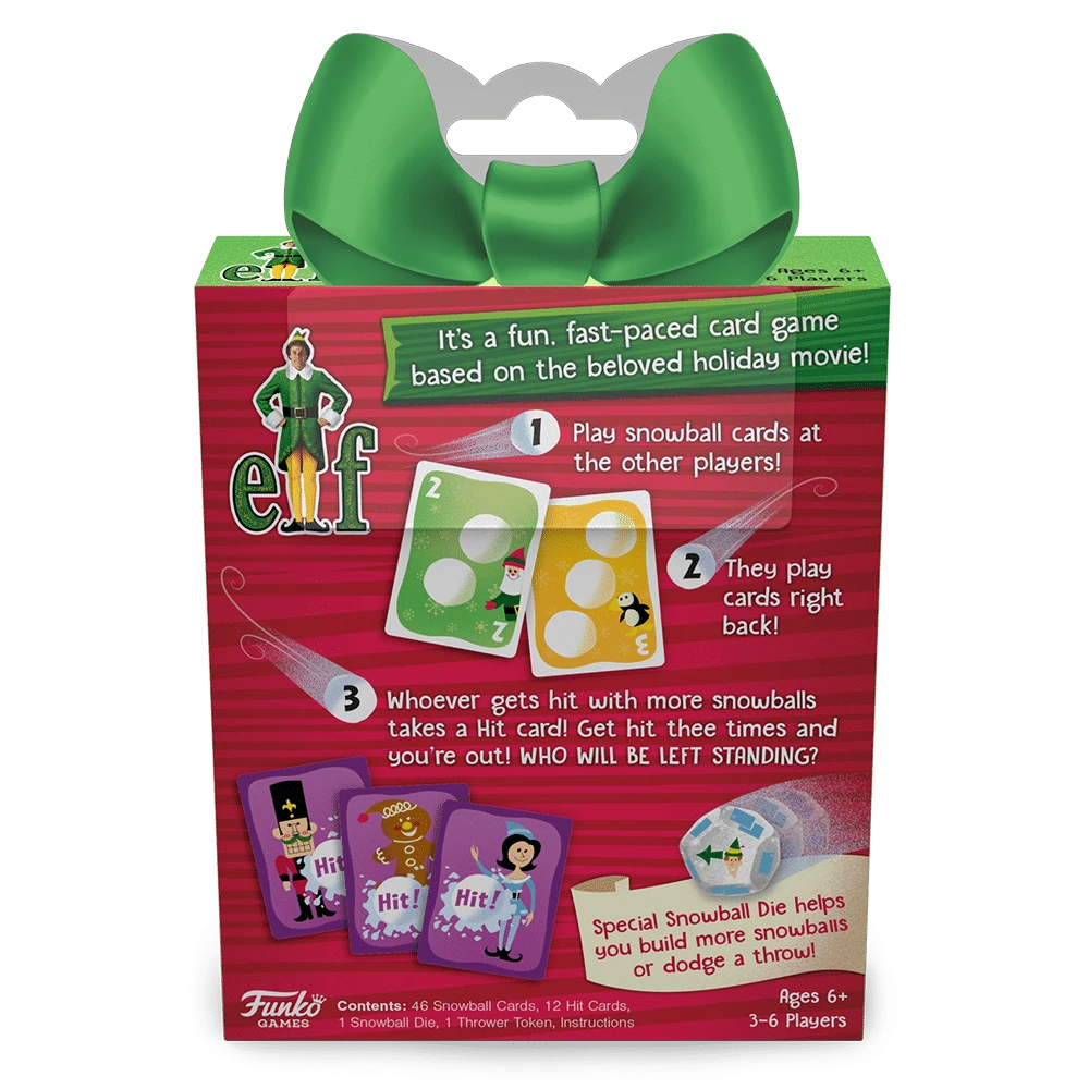 Join Buddy the Elf in a surprise snowball fight! “Throw” a set of likecolored snowball cards at another player and they can return fire! When you’re the target, roll the jumbo snowball dice to dodge the icy barrage. When you get hit, take a snowball “splat” card-three hits and you’re out. In this frigid fight, the last elf standing wins!