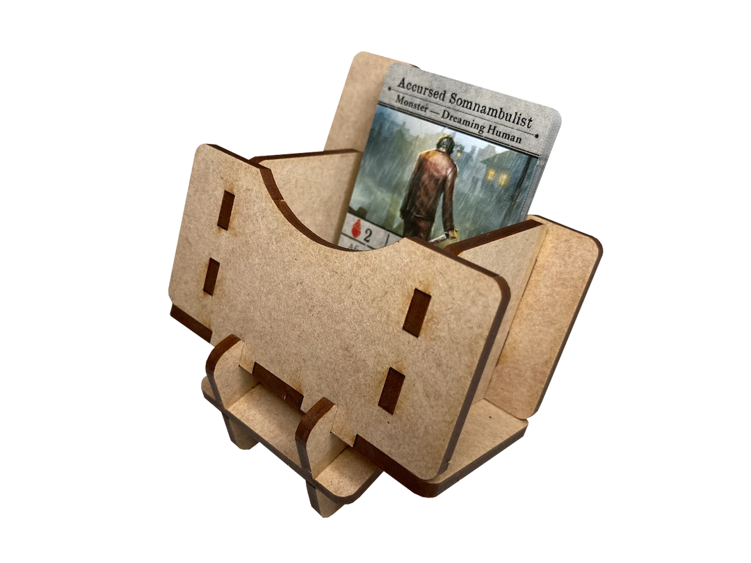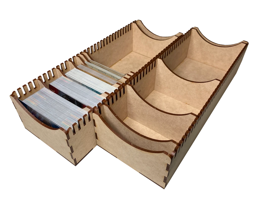 Arkham Horror 3rd edition posed a unique challenge with regards to the event and monster deck dispenser. Once built, they consume a large volume of space in the box and cardboard doesn’t last forever with heavy use. For this reason, we designed an event and monster deck dispenser out of wood that stores within the box and functionally replaces the FFG cardboard event deck dispenser.