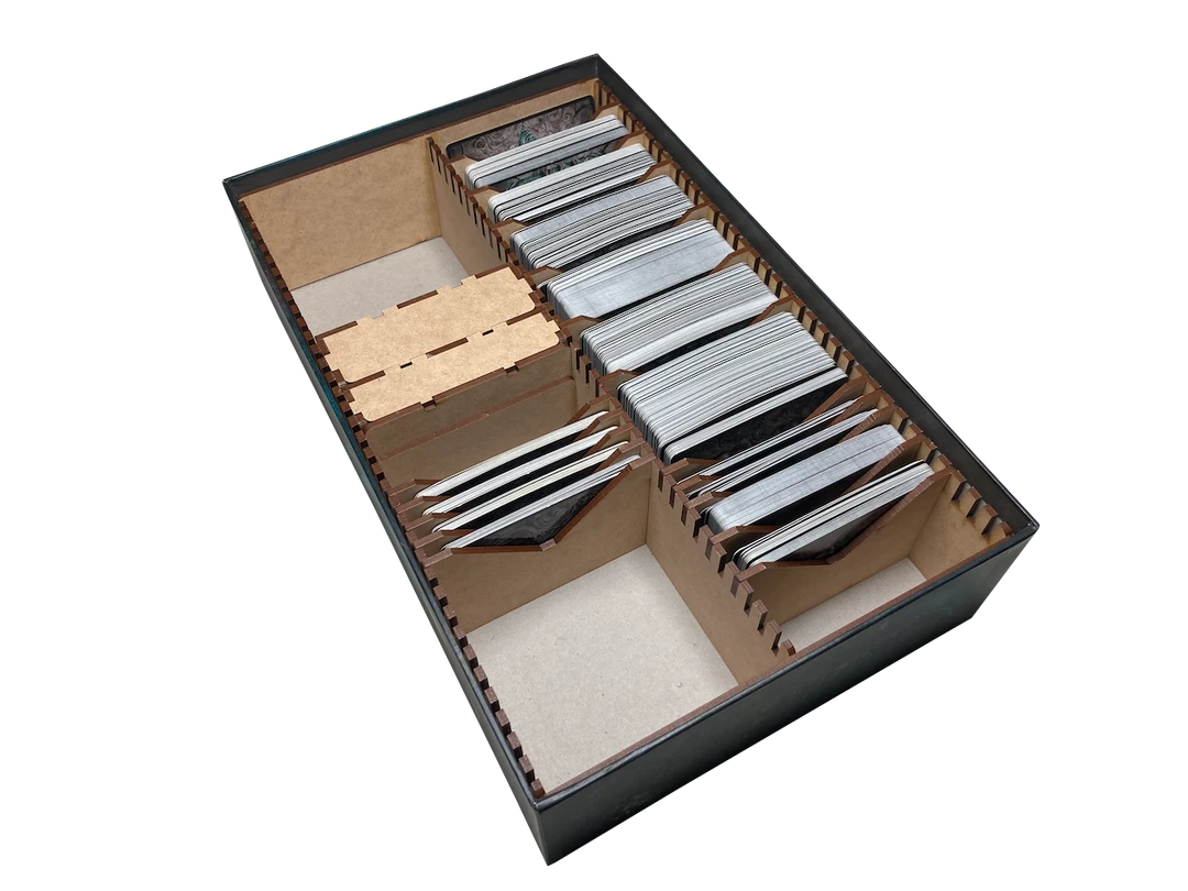 Ascension has been a favorite at our table for years. The one thing we struggled with was card storage as we added expansions. This organizer provides two card storage lanes that can handle sleeved or unsleeved cards. There is a dedicated storage area for the two (2) tier, stacked bit trays. We include sixteen (16) wood dividers and you can purchase more if needed.