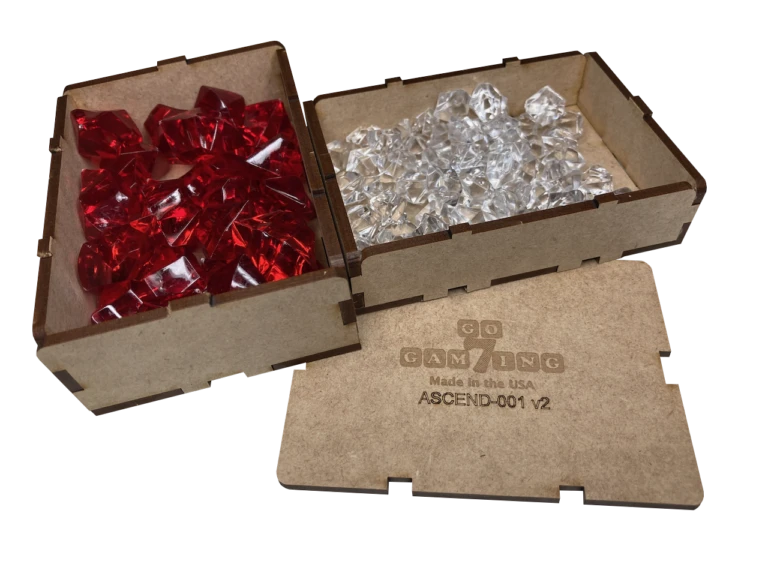 The Go7 Gaming organizer for Ascension features two card storage lanes, sixteen (16) wood dividers, and a two-tier, lidded bit box for your honor tokens. This insert fits in the first-edition Chronicle/Storm-sized box.