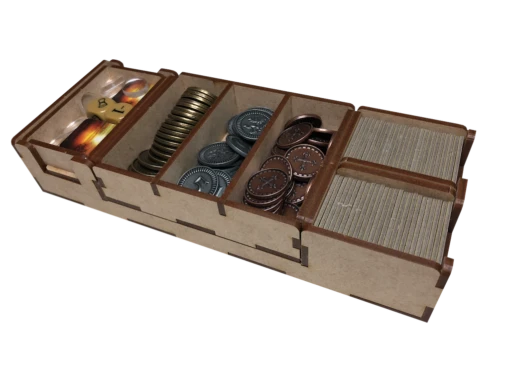 - four (4) player trays that feature dedicated compartments for each class of component (general, meeples, whiskey, bread, etc.). The player storage trays also double as player boards during play and include an acrylic overlay that organizes your components during play.