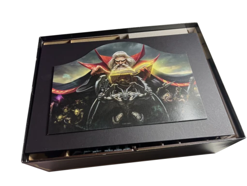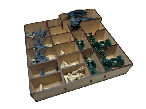 The Go7 Gaming organizer for HeroQuest (2021 edition) provides storage for the base game, Mythic content, and the Keller’s Keep and Return of The Witch Lord expansions.  Our solution uses the base game box to store all components and there are a few open slots to store Commander of the Guardian Knights minis (2) and more!