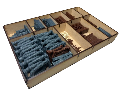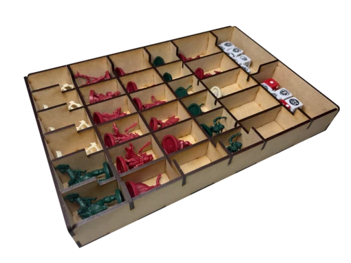 The Go7 Gaming organizer for HeroQuest (2021 edition) provides eight trays of storage for the base game, the Mythic content, as well as the Keller’s Keep and Return of the Witch Lord expansions.  Our solution uses the base game box to store all components and there are a few open slots to store Commander of the Guardian Knights minis (2) and more!