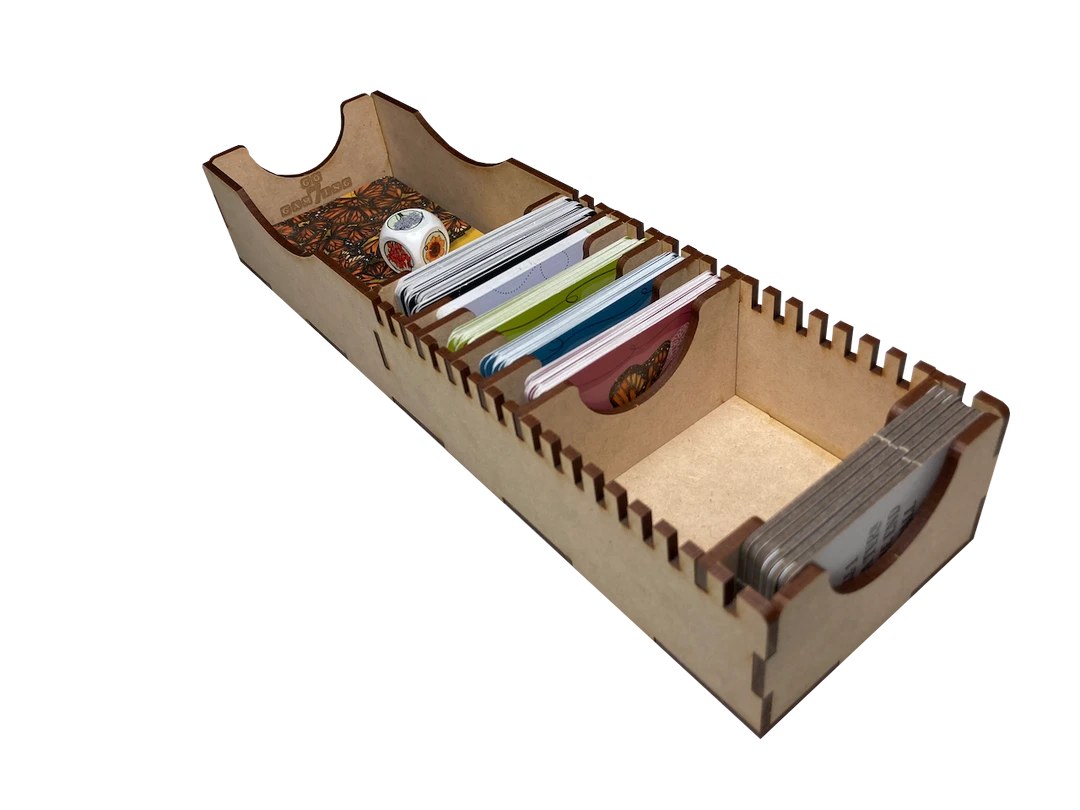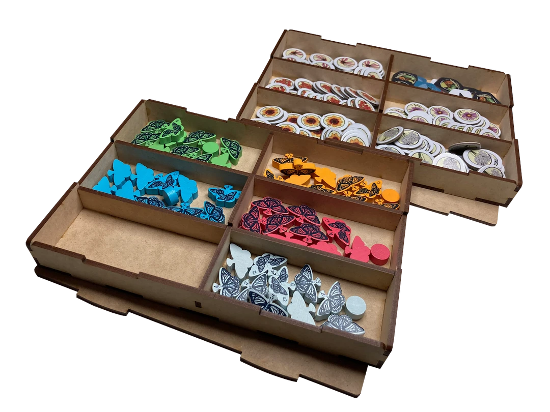 The Go7 Gaming organizer for Mariposas includes three trays to help you get the game to the table fast and effortlessly. Â This solution also allows for future expansion trays, if needed.