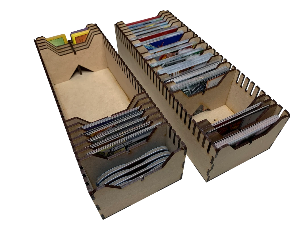 - two (2) large card trays, supporting sleeved or unsleeved cards
