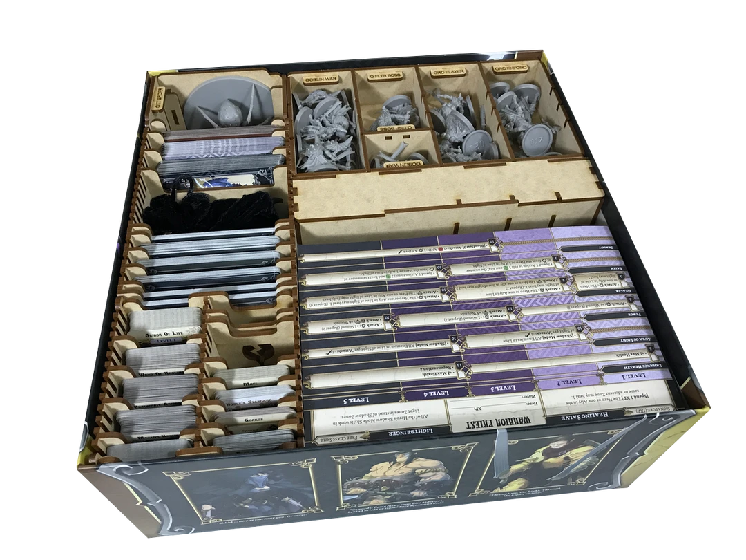 Our storage solution for the Massive Darkness™ base game conveniently stores all base game components including player dashboards, class pads, tokens, dice, minis, cards, and tiles. This kit includes four (4) removable trays and a large base insert that is intended to be permanently stored in your game box. This solution provides a total storage solution for the Kickstarter or retail base game contents, plus the Crystal and Lava tiles.