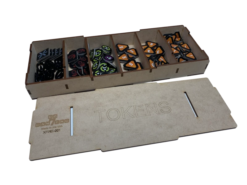 - one (1) removable, lidded token tray to store your tokens and damage clips that can be built in one of two different configurations