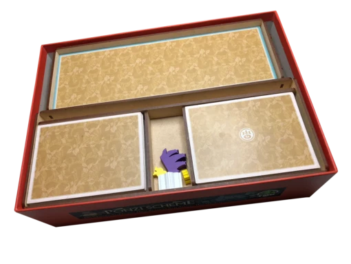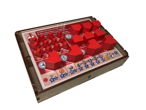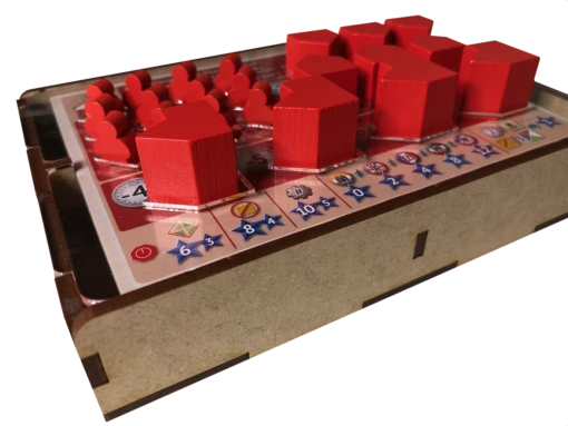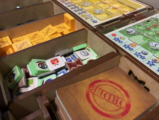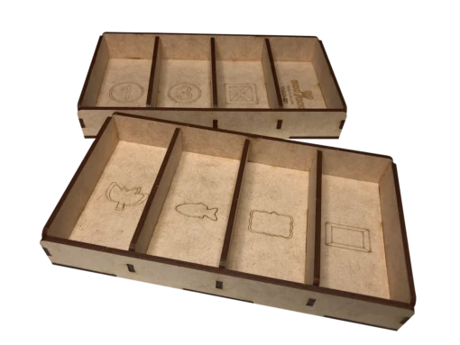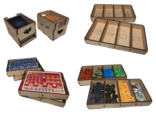 - one (1) top tray that provides storage for all player boards and larger tokens. We provide convenient lift cutouts beneath each compartment for quick removal of components