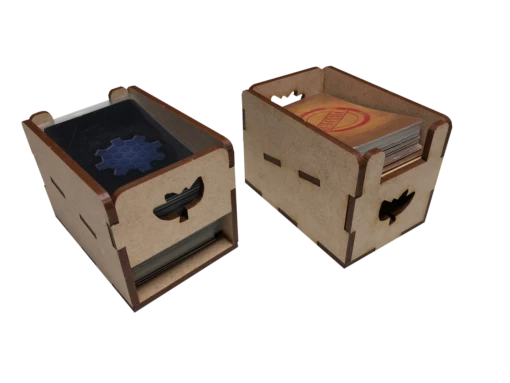 - two (2) card trays for storing small cards that act as deck dispensers during play. The deck dispensers offer card storage on top of and inside the dispenser to speed setup and storage of your game.