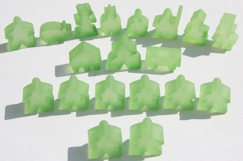 You will receive a complete set of characters (19 meeples) of the Carcassonne basic game and all expansions for one player in the “frosted” matt-transparent color light green in a zip bag.