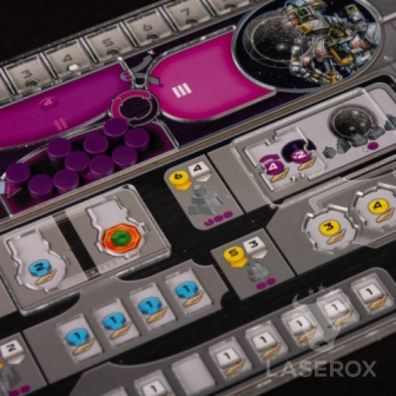 Comes with clips to be attached to the playerboards. The overlays are slightly larger than the playerboards, to ensure enough material on the edges around the cut-outs.