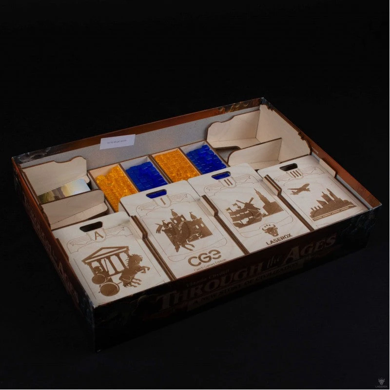 Wander through the Ages and make sure, your cubes and workes are have a firm ground. Our organizer designed to fit the new edition of Through the Ages from Czech Games will make sure that you have everything neatly stored.