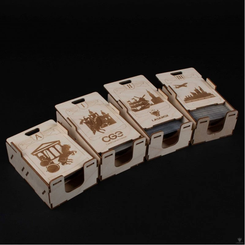 - 4 unique card trays for the different ages with dividers, so you can store the cards for playercount and background