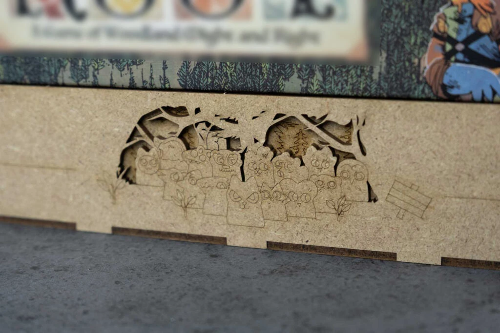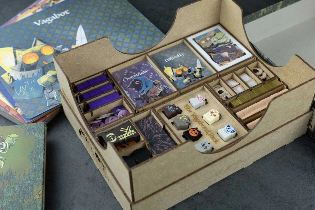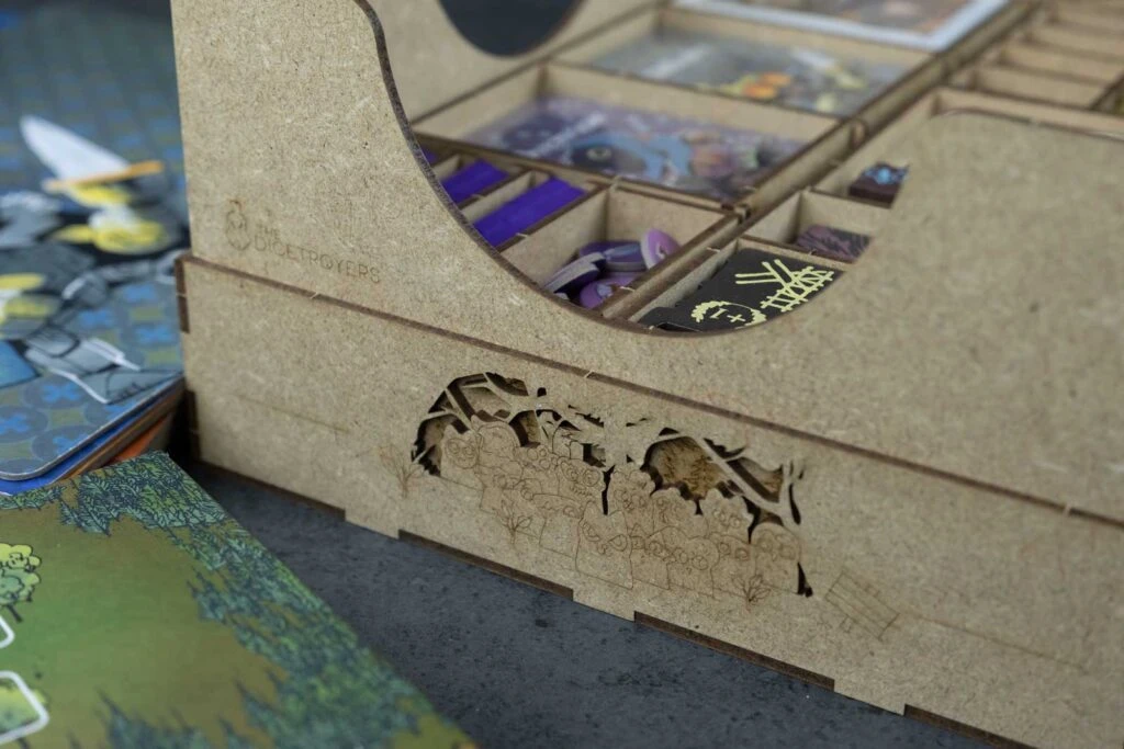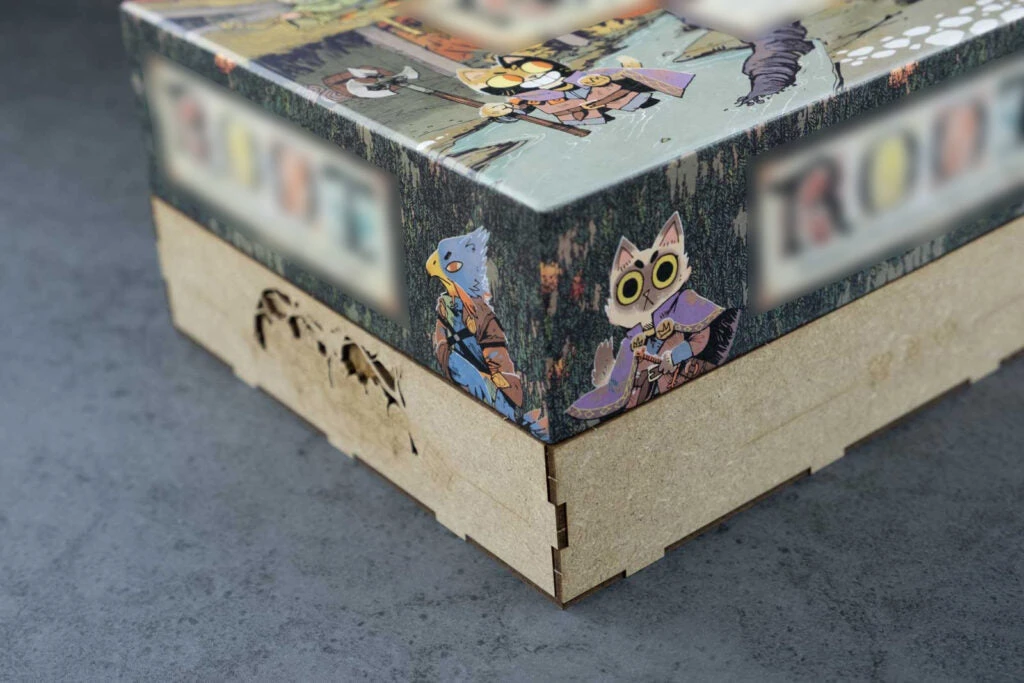 - 1x lifted base to house the whole organizers for Root + Riverfolk exp and Root Expansions (Underworld; Clockwork; The Exiles and Partisans; Vagabond Pack) and game components and close everything flush with the original game’s lid; the double layered base guarantees strength, stability and a perfect closure of the box.