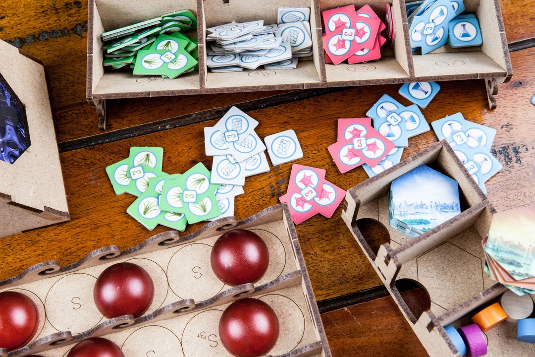 • 1x container for normal and symbiotic cities, with guide engravings for positioning and number of players. Space for more cities (eg biodome promo);