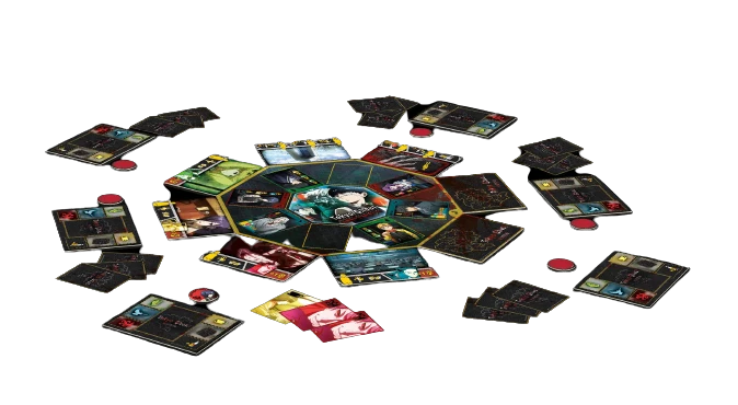 In the bluff-and-deduction board game Tokyo Ghoul: Bloody Masquerade, you play as one of fifteen different characters from the anime, including Kaneki, Touka, Juzo, and Rize. Whether you are a mere human, a ghoul, or an investigator, roam the streets of Tokyo, keep your identity a secret, investigate, and cover your tracks. The investigator and the ghoul want to find and kill each other, while the humans are trying to collect two or three of the same card. Players take actions during the game to pass around cards, which gives them information bit by bit about who each player might be.