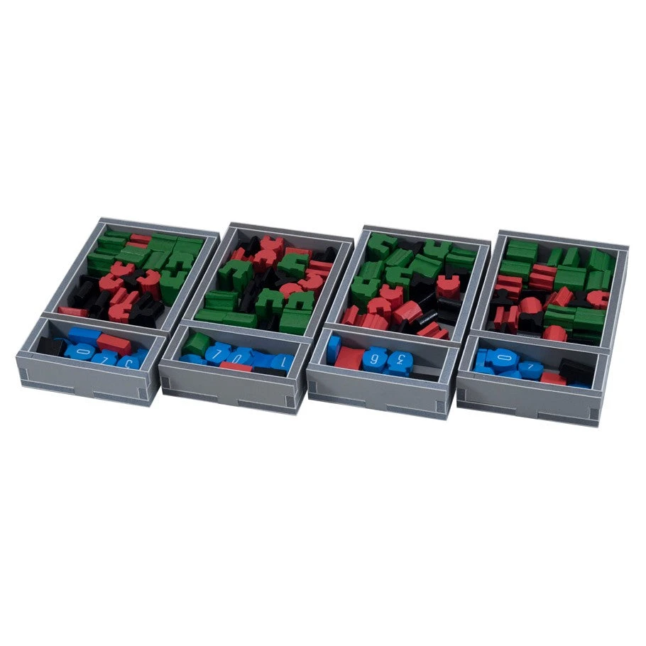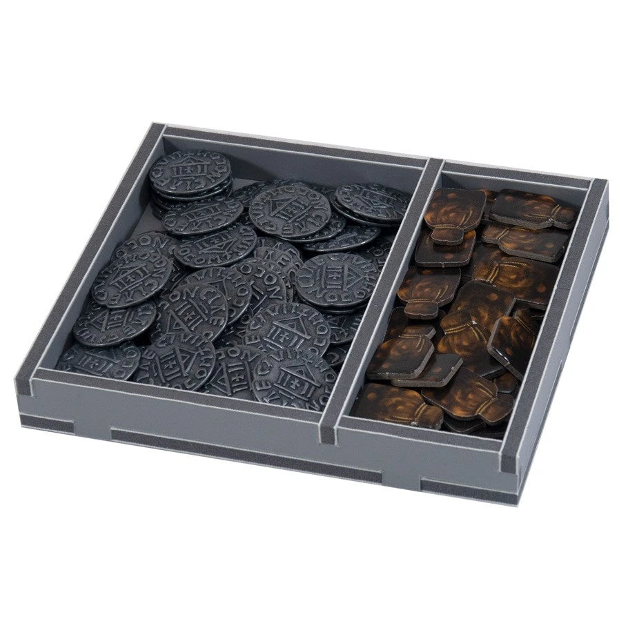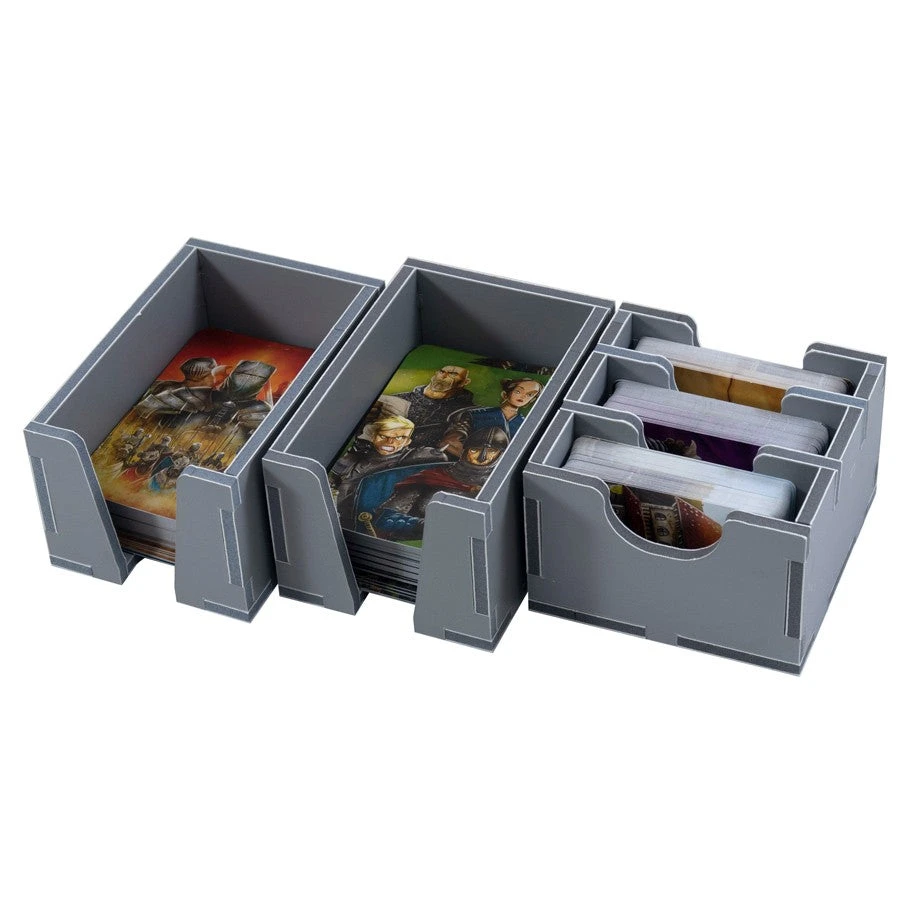 Insert compatible with Paladins of the West Kingdom®. The design provides both efficient storage and improved game play. Many of the trays can be utilized during the game, and they greatly aid set-up and clear-away times. The rules and boards act as a lid on top of the trays.