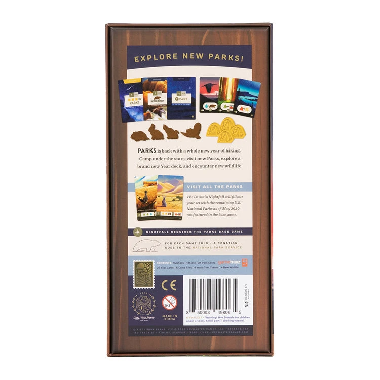Welcome to PARKS Expansion: Nightfall. In Nightfall, you’ll find new Park Cards featuring new rewards and all new artwork from the Fifty-Nine Parks Print Series, including the 17 parks not represented in the base game. This expansion also includes new Year Cards and Bonus Scoring opportunities, and you’ll get to experience the trail in a brand new way with the new Camping mechanic.