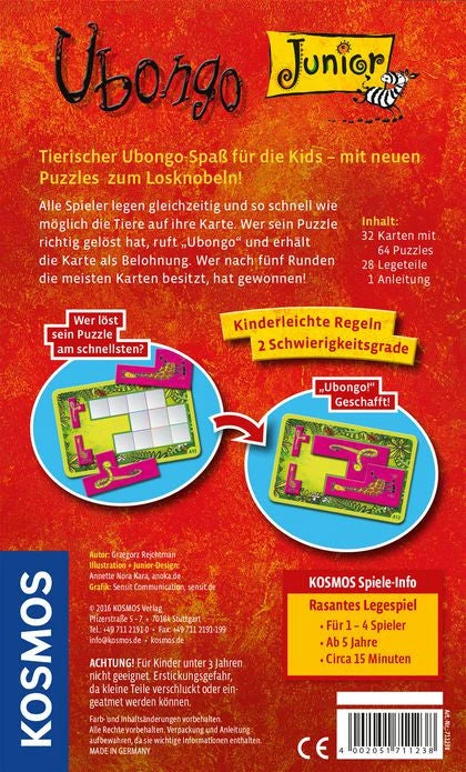 Ubongo Junior Mitbringspiel is a travel-sized version Ubongo Junior, with all players competing at the same time each round to place all of the animals on their board as quickly as possible. Whoever calls “Ubongo!” first keeps the card as a reward, and whoever ends up with the most cards wins! Two difficulty levels are included to help balance the challenge between skilled and novice players.