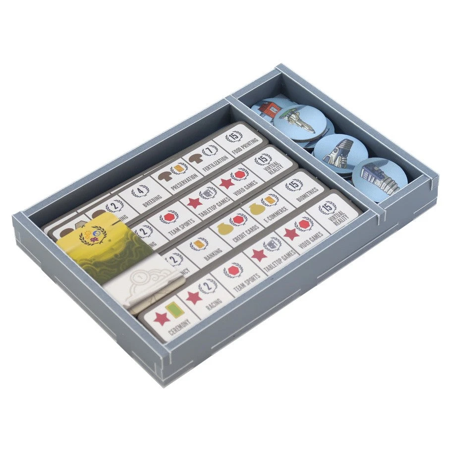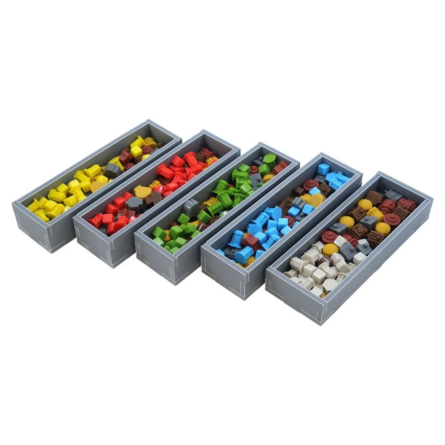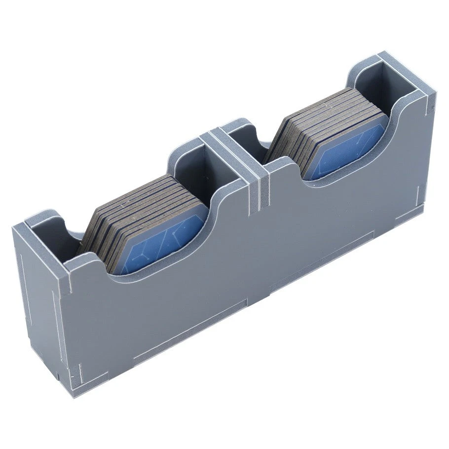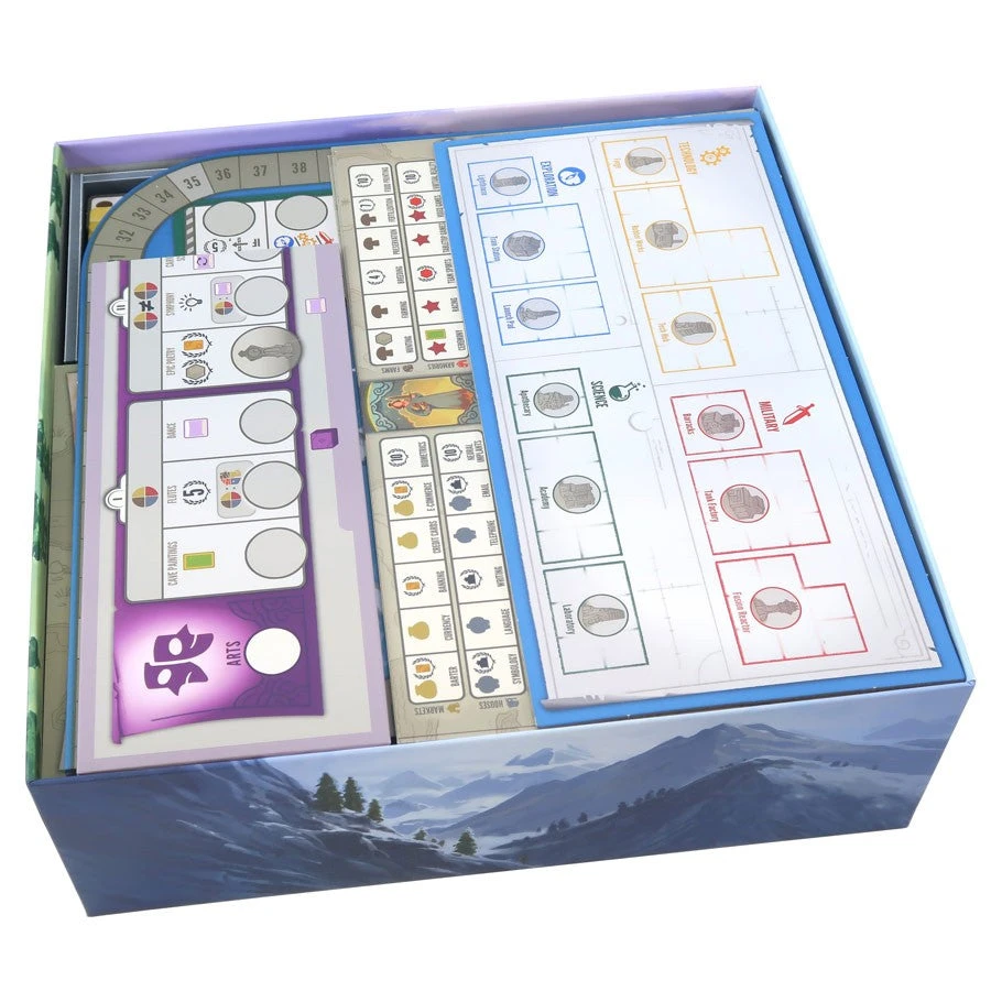 Insert compatible with Tapestry®, including the Plans & Ploys® and Arts & Architecture® expansions. The design provides both efficient storage and improved game play. Many of the trays can be utilized during the game, and they greatly aid set-up and clear-away times. The boards and rule books act as a lid on top of the trays.