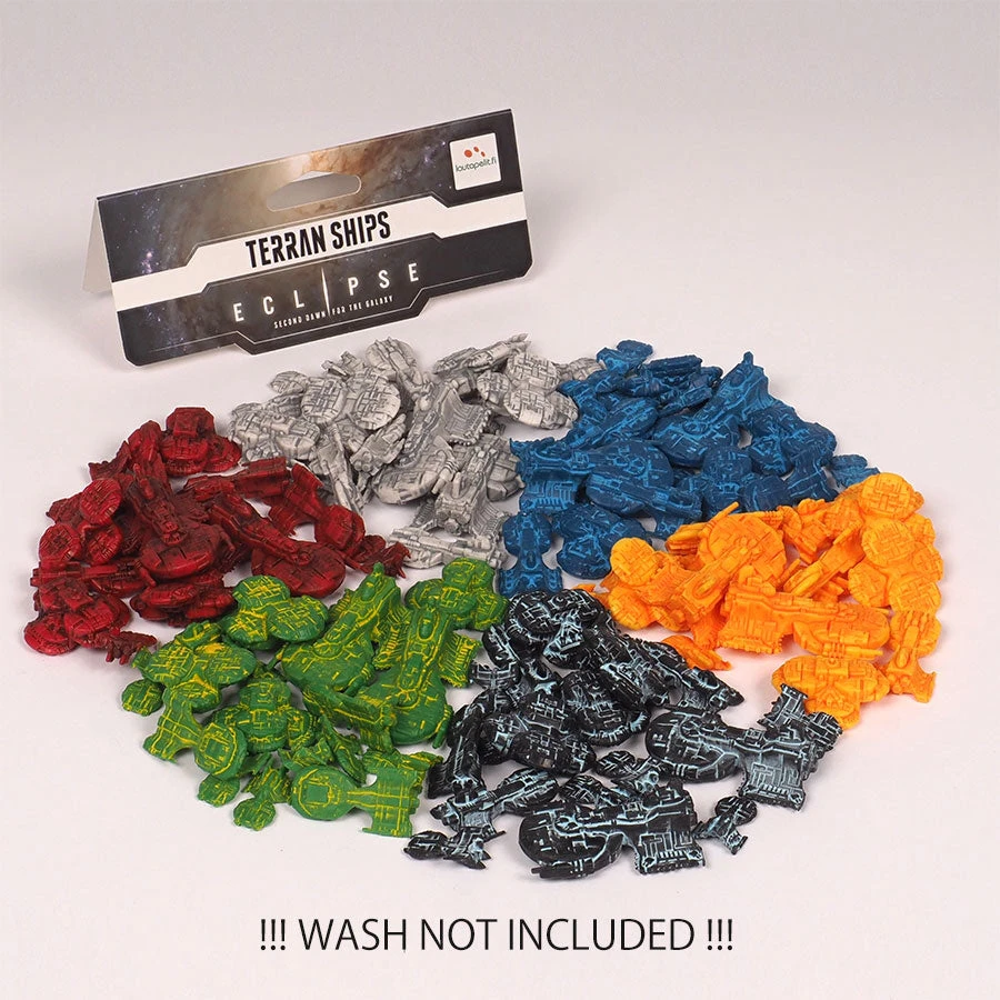 The Eclipse – 2nd Dawn for the Galaxy base game includes ships for six different alien species. Eclipse – 2nd Dawn: Terran Ships adds 18 Terran Ships in each player color, so everyone can easily see who has chosen to play as Terrans.
