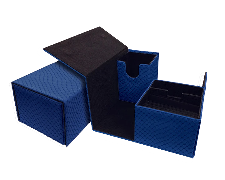 Exclusive textured “Dragonhide” Vinyl box. Holds 2 EDH decks with room for dice and tokens. Comes with a custom designed spindown life counter.Â