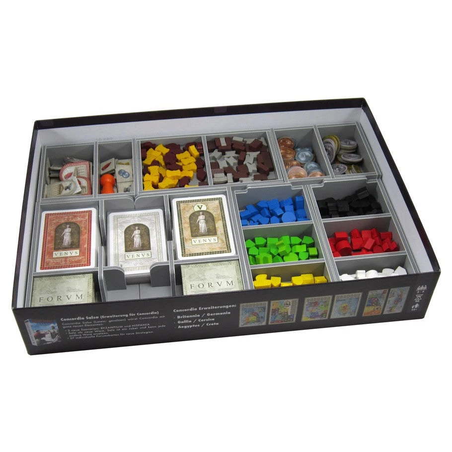 This insert is designed to be compatible with Concordia®. The trays have sufficient space for the Venus® and Salsa® expansions. There is space for all cards to be sleeved. The insert works in either the base game box, as shown, or in the new Concordia Venus base game box, images of this below.