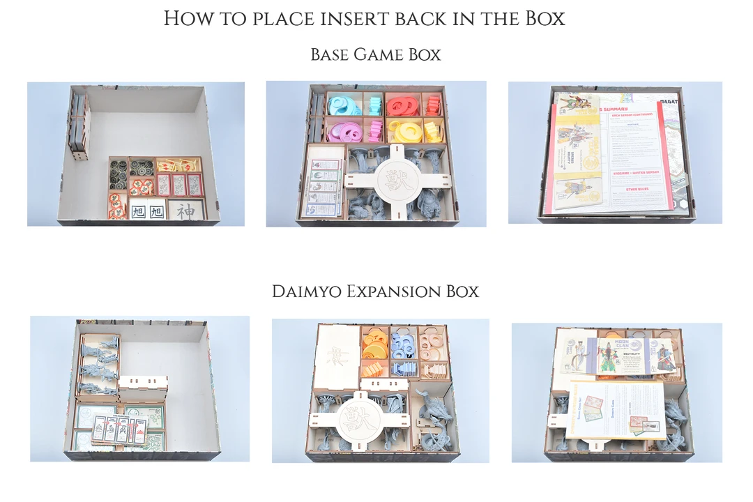 - The insert for Daimyo is designed so that each of the expansions is stored in separate trays, allowing the flexibility to choose which expansions to play while leaving the unused expansions in the box.