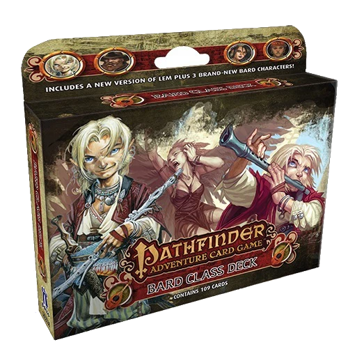 Bring your troubadour to any tavern with the Pathfinder Adventure Card Game Bard Deck . Explore four different bard characters in this 109-card set, from Lem the magic researcher to Siwar the information broker. The Bard Deck features diverse new allies, weapons, spells, and other loot to take your character all the way through any Pathfinder Adventure Card Game Base Set or Pathfinder Society Adventure Card Guild organized play campaign. Play on!