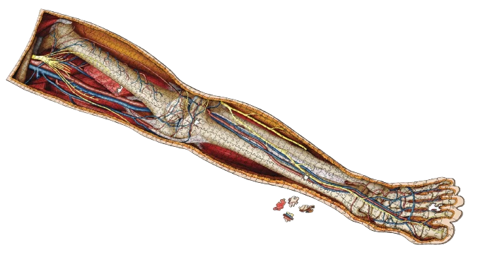 In the seventh volume of Dr. Livingston’s Anatomy Jigsaw Puzzles, you’ll assemble an accurate cross-cut section of the left leg that gives you a detailed interior view from posterior’s gluteus medius muscle to toe’s middle phalange. Focusing on the skeletal structure, this puzzle shows how the basal, intermediate, and distal segments are oriented. See the many joints that enable us to flex and extend our lower limbs to be bipedal. The pelvis meets the femur, giving way to the patella, tibia, and fibula for an optimal blend of rigidity and flexibility. Various, delicate tarsals, metatarsals, and phalanges allow us to maintain our balance. Veins and arteries are interwoven, carrying vital oxygenated blood and removing deoxygenated blood.