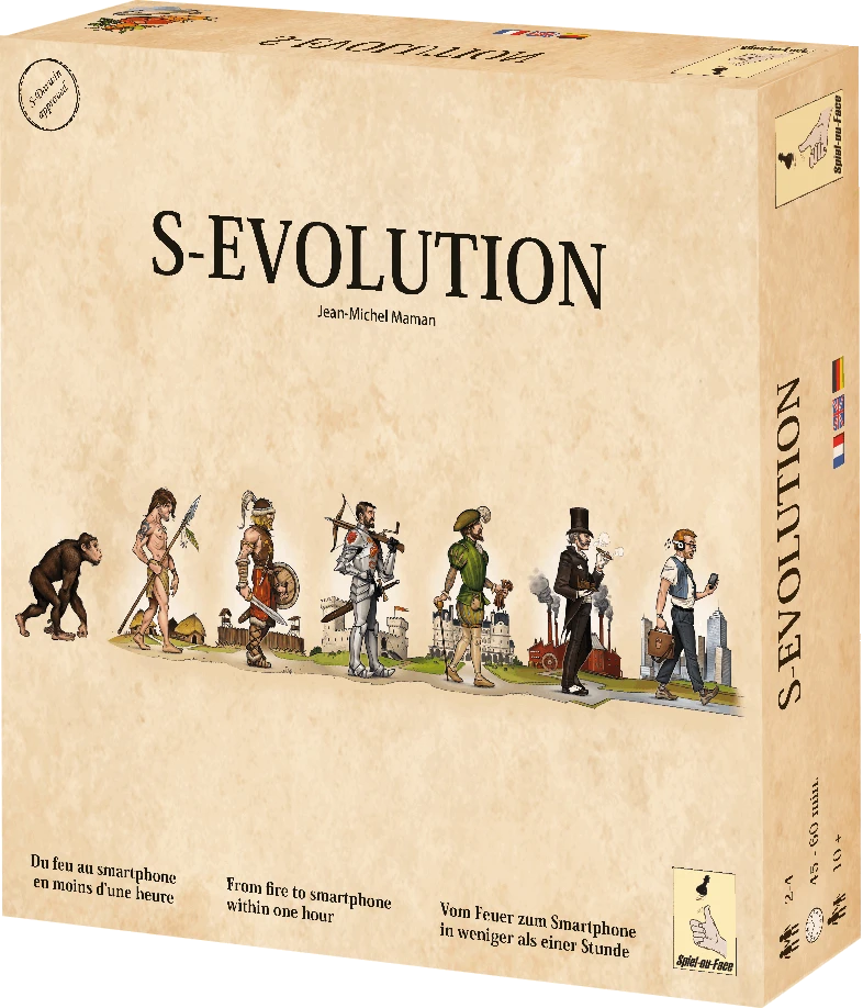 S-Evolution is a unique combination of a classic card game — with tricks, colors and trump — and of a typical “Eurogame” of resources management and civilization. Each player has a deck of 24 cards, and in each of the six rounds, he draws a hand of four cards from this deck. Each player starts the game in Age 1 and adds the progress card of this age to his deck.