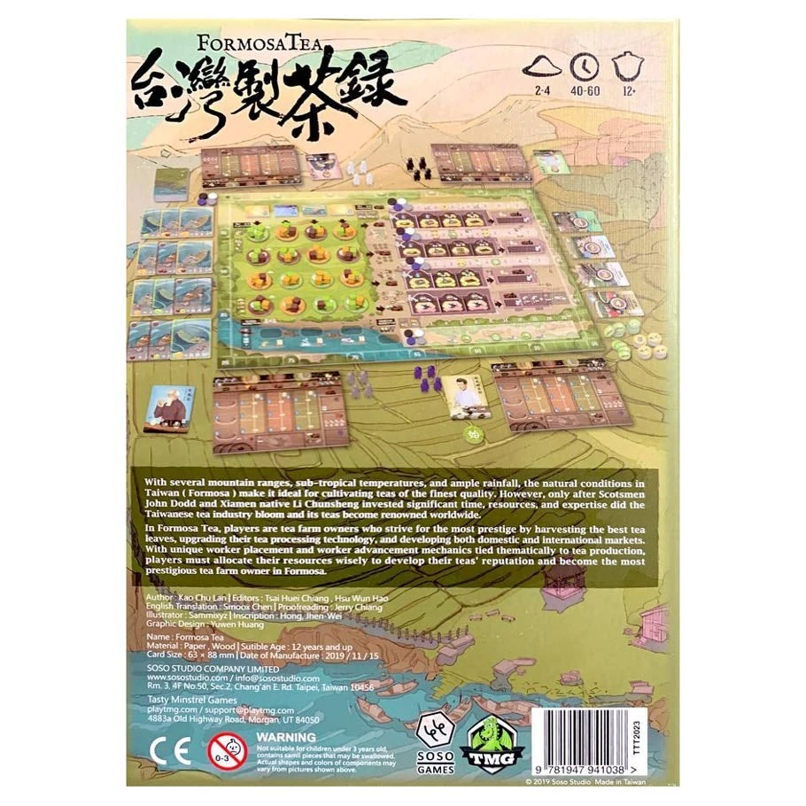 In Formosa Tea, players are tea farm owners competing to harvest the best tea leaves, improve their tea processing techniques, and produce tea of the highest quality for not only the domestic market but also for the international market. With the unique worker placement and worker advancement mechanisms, along with the tea dehydration and scenting processing, players must use their workers wisely to make the best tea in the market.