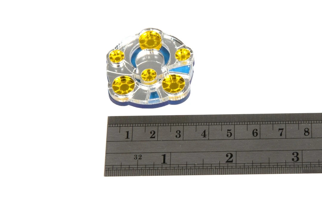 This set includes 1 red, 1 yellow, and 1 blue token layered with a silver mirrored pattern and embedded with yellow mirrored gems.