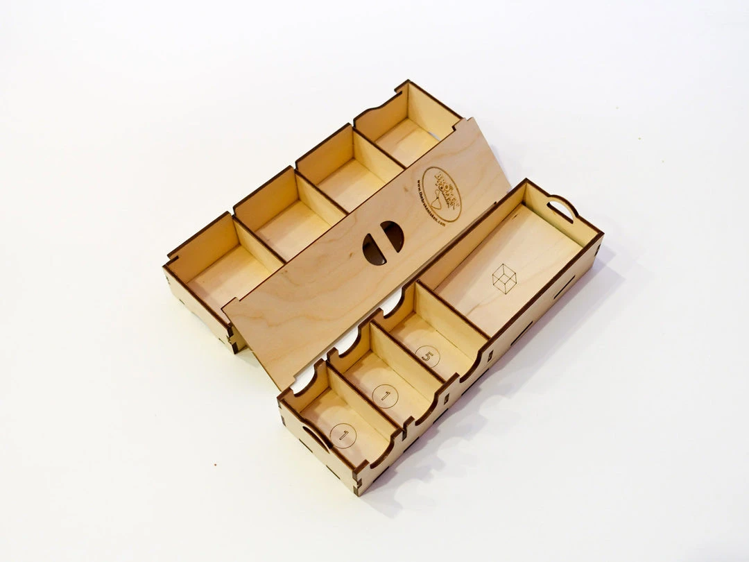 Our Among the Stars Organizer features two removable trays and plenty of card storage. It supports all existing expansions with plenty of room for growth. Like all of our organizers, it supports sleeved cards and comes with 8 adjustable dividers. Cards are stored at an angle to support even the largest card sleeves in the existing game box. Works great with Fantasy Flight FFS65 square card sleeves.