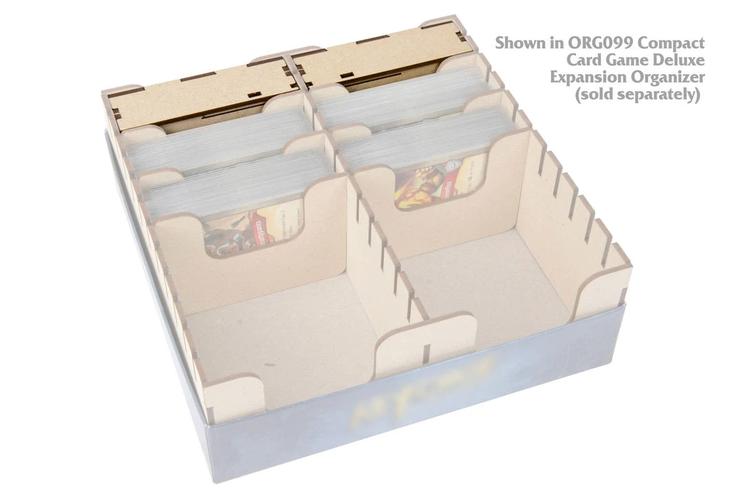 The box fits into other organizers that take standard card sizes as if it were a deck of cards 29mm (1.17″) thick. Comes with two removable dividers allowing for 4 unique compartment configurations.Â
