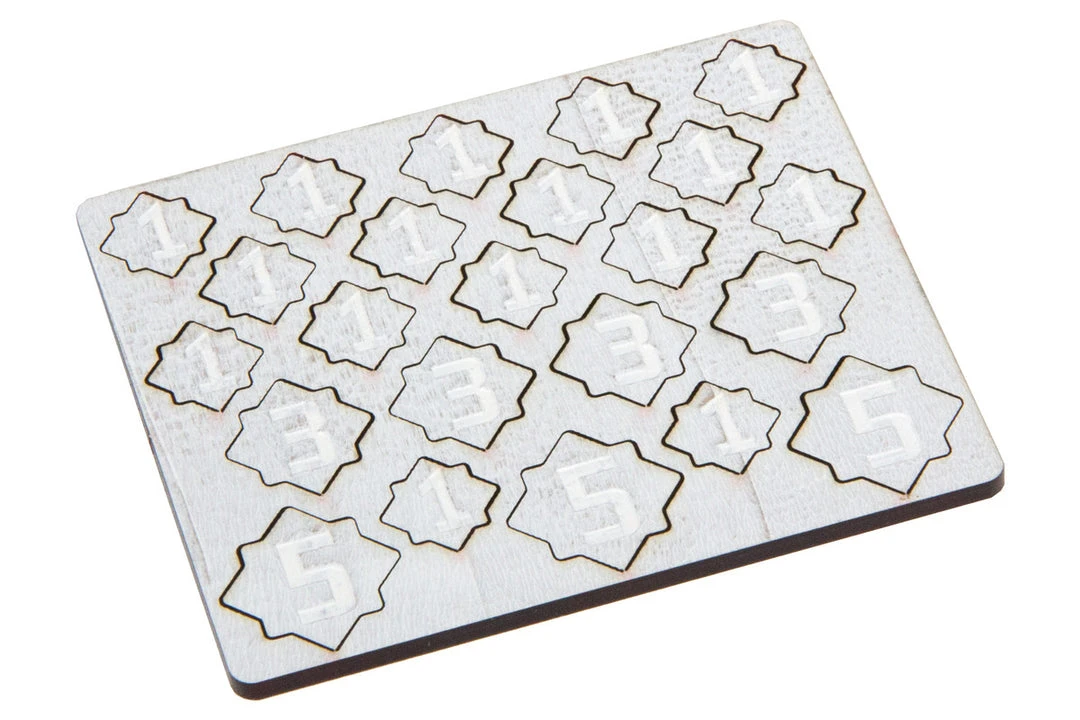 This set includes 16 tokens engraved with a ‘1’, four tokens engraved with a ‘3’, and three tokens engraved with a ‘5’.
